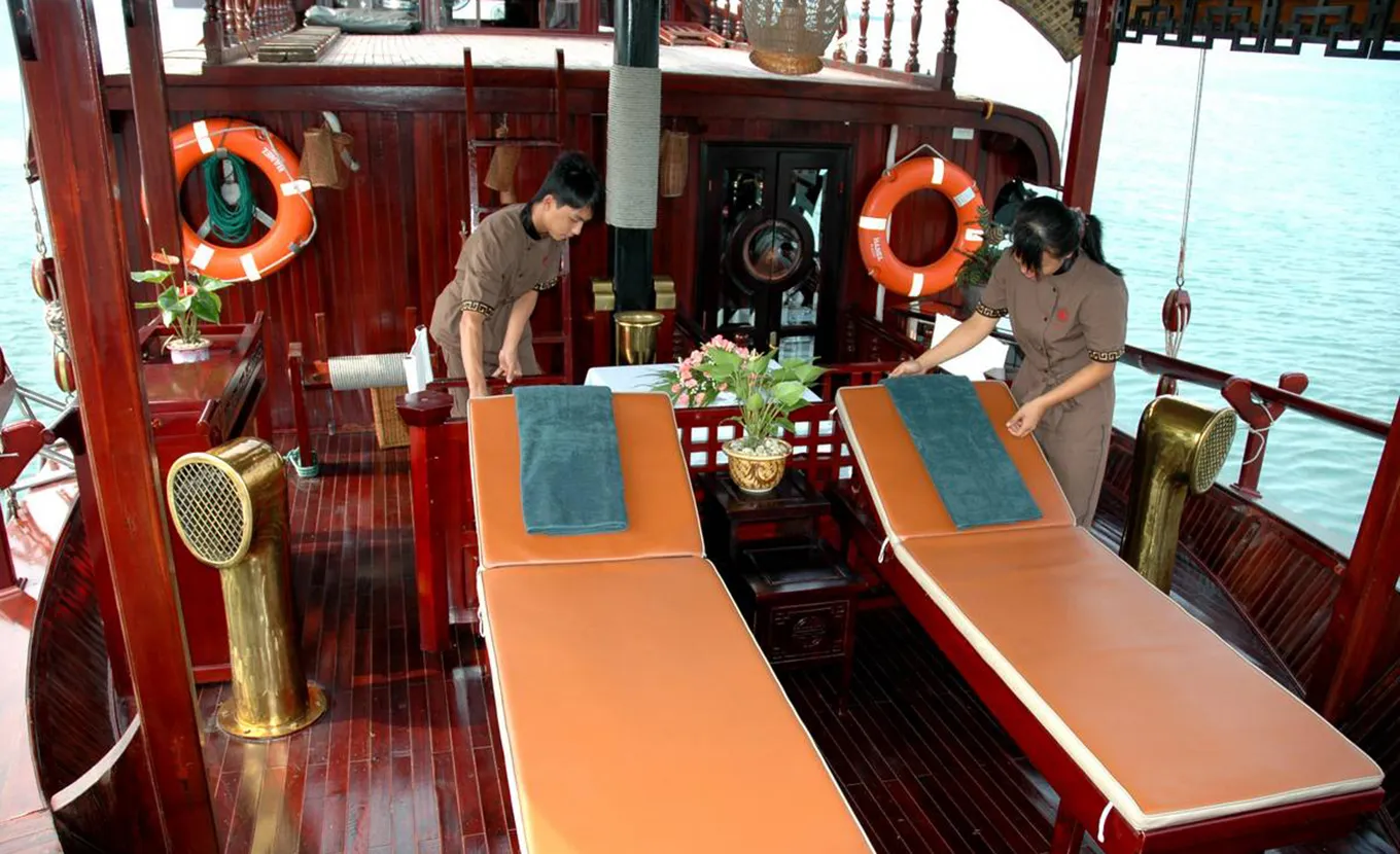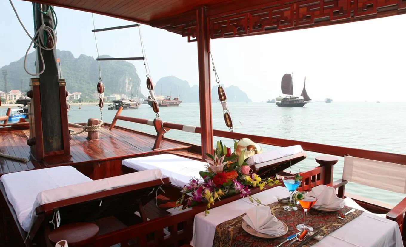 Unsere L'Amour Dschunke ist im Stil der traditionellen Segelboote gestaltet und war die erste kleine Deluxe-Dschunke mit einer Kabine in der Halong-Bucht. Sie ist eine ideale Option für ein Paar auf einem romantischen Ausflug.