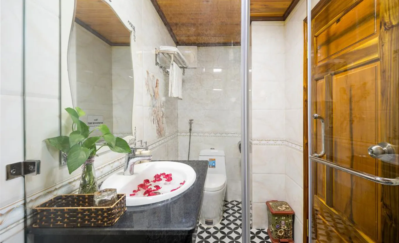 Nach dem Kajakfahren und Schwimmen, wieder auf dem Boot. Von hier entspannen Sie einfach auf dem obersten Deck und genießen Sie die Landschaft, während sich das Boot sanft zur Halong-Bucht windet.