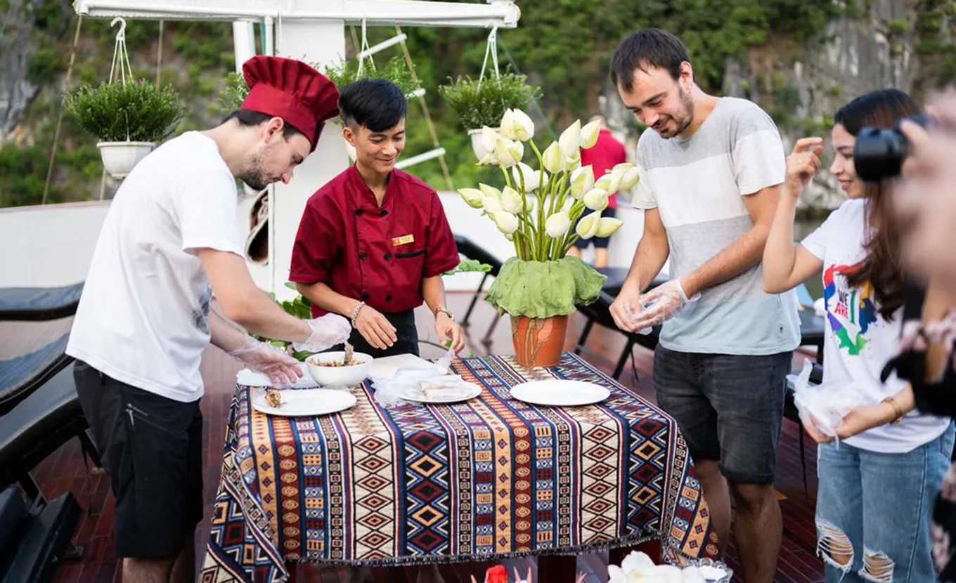 12:15 Check-ein und die Dschunke beginnt die Fahrt nach Lan Ha-Bucht . Es reist durch ein schwimmendes Fischerdorf. Genießen Sie die fauststündige panoramae Kreuzfahrt in Lan Ha Bay zwischen Hunderten von atemberaubenden Kalksteininseln vor dem Mittagessen stopp an den Stränden von Ba Trai Dao.