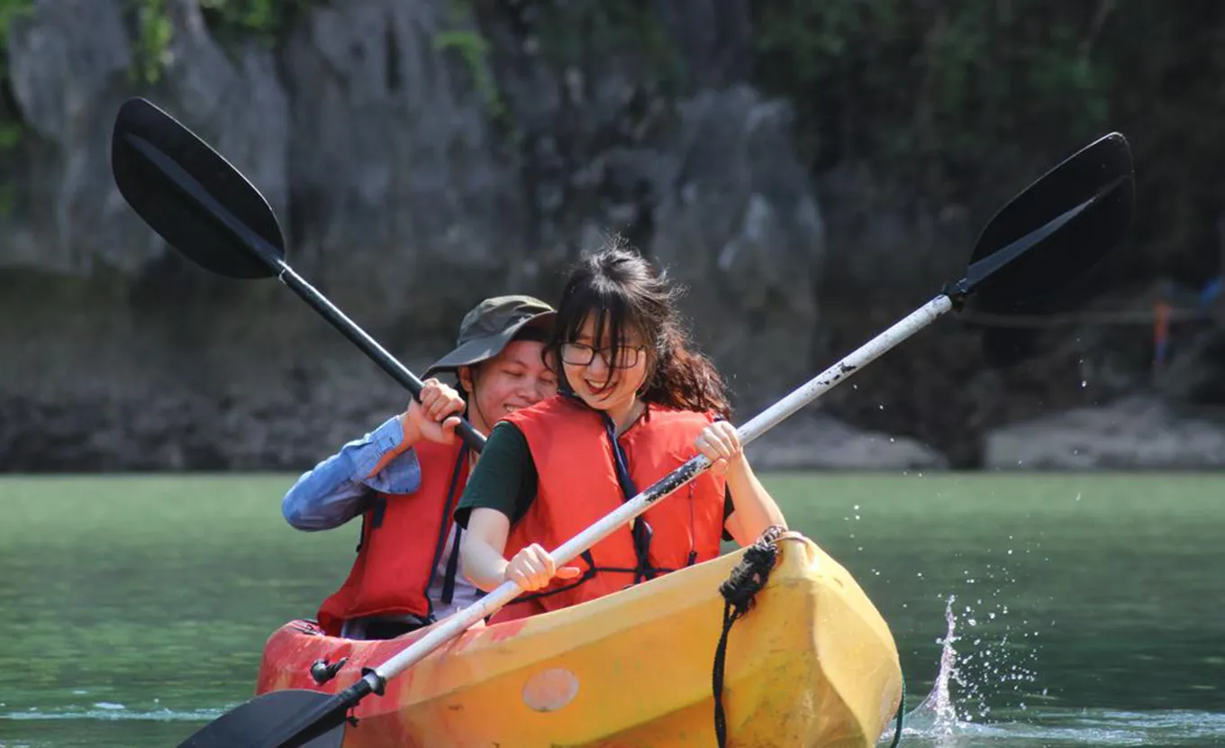 Es wird ein Mittagessen auf der Grundlage von Meeresfrüchten serviert, gefolgt von einem Moment der Entspannung auf dem Deck oder in der Lounge, während das Boot im Bereich der Ong Cam segelt, wird eine Kajakfahrt zum Tunnel zur CA angeboten. Durch den Tunnel gelangt man in den See, der vollständig von Klippen umgeben ist. Wir ankern zum Abendessen und übernachten in der Bucht