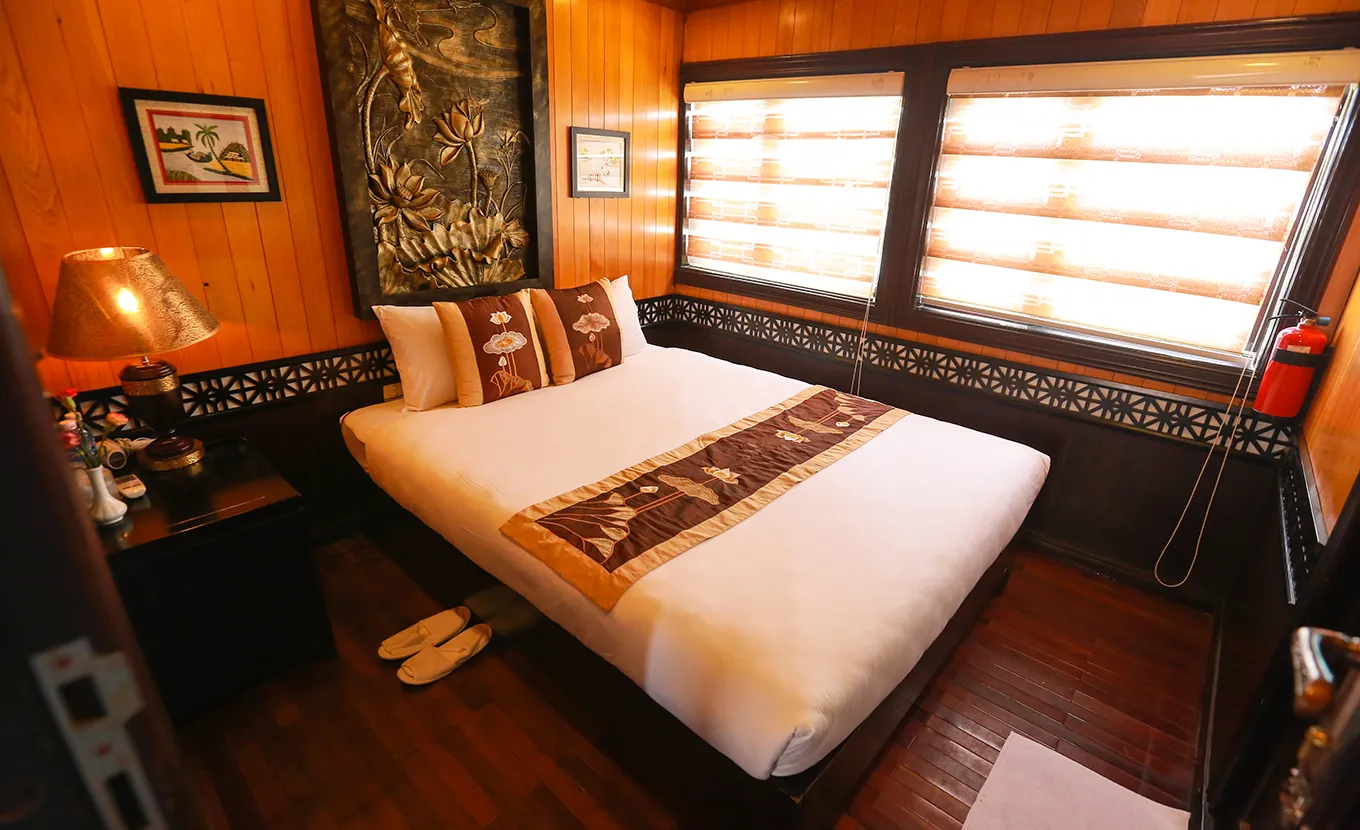 19h00: Suntuosa cena a bordo.20.30 - 22.00: Tiempo libre para desafiarse a sí mismo en juegos de rompecabezas vietnamitas o reunir a su grupo / familia para un juego de mesa; probar suerte con la pesca del calamar o simplemente tomar un cóctel y disfrutar de la noche tranquila en la bahía.
