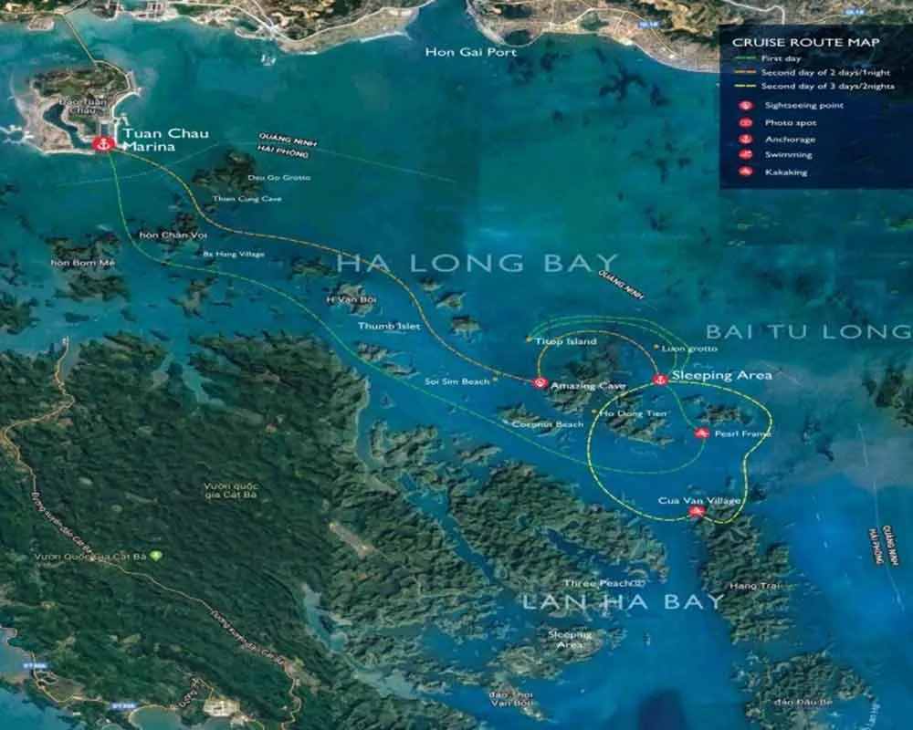 14:00: Después del almuerzo continuamos la exploración en la BAHÍA DE HALONG pasando por el pueblo flotante de Cua Van, la cueva de Tien Ong, la cueva de Trong, la cueva de Ho-dong Tien, la cueva de Luon... También tenemos la oportunidad de experimentar lo hermoso que es para el Quemador de Incienso, la Isla de la Piedra del Perro, el Gallo de Pelea, la playa de Soi Sim, la Isla de tres Cocos