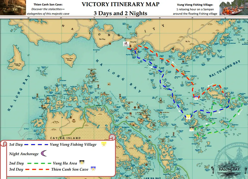 Inspirado por la fabricación de barcos tradicional , el Victory Cruise es el símbolo de la legendaria belleza de la Bahía de Halong. Maderas preciosas tropicales, decoraciones de bellas artes y un personal dedicado le llevarán a un viaje maravilloso para descubrir la bahía de Ha Long.