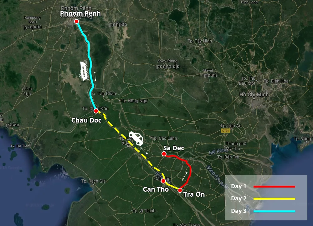 Explore el Delta del Mekong en el bote privado Gecko Eyes de 01 cabina. El recorrido de 3 días le ofrece una experiencia verdaderamente única, sea testigo de la tranquilidad del campo e interactúe con la gente local en el Delta del Mekong antes de disfrutar de 5 horas en lancha rápida a la capital de Camboya, Nom Pen.