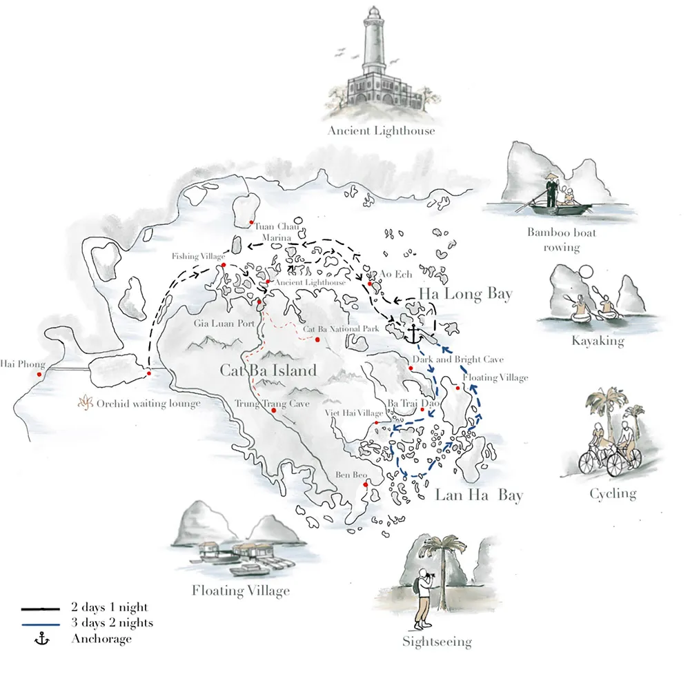 Viaje de 3 días y 2 noches en el crucero Orchid Premium con la máxima privacidad para su viaje en crucero por la Bahía de Halong. Todas las cabinas están bien diseñadas con grandes ventanas de vista completa abiertas al mar para que usted pueda disfrutar de su propia Bahía de Halong - Bahía de Lan Ha desde su balcón privado, garantizado para traerle el recuerdo inolvidable de nuestro legendario paisaje.