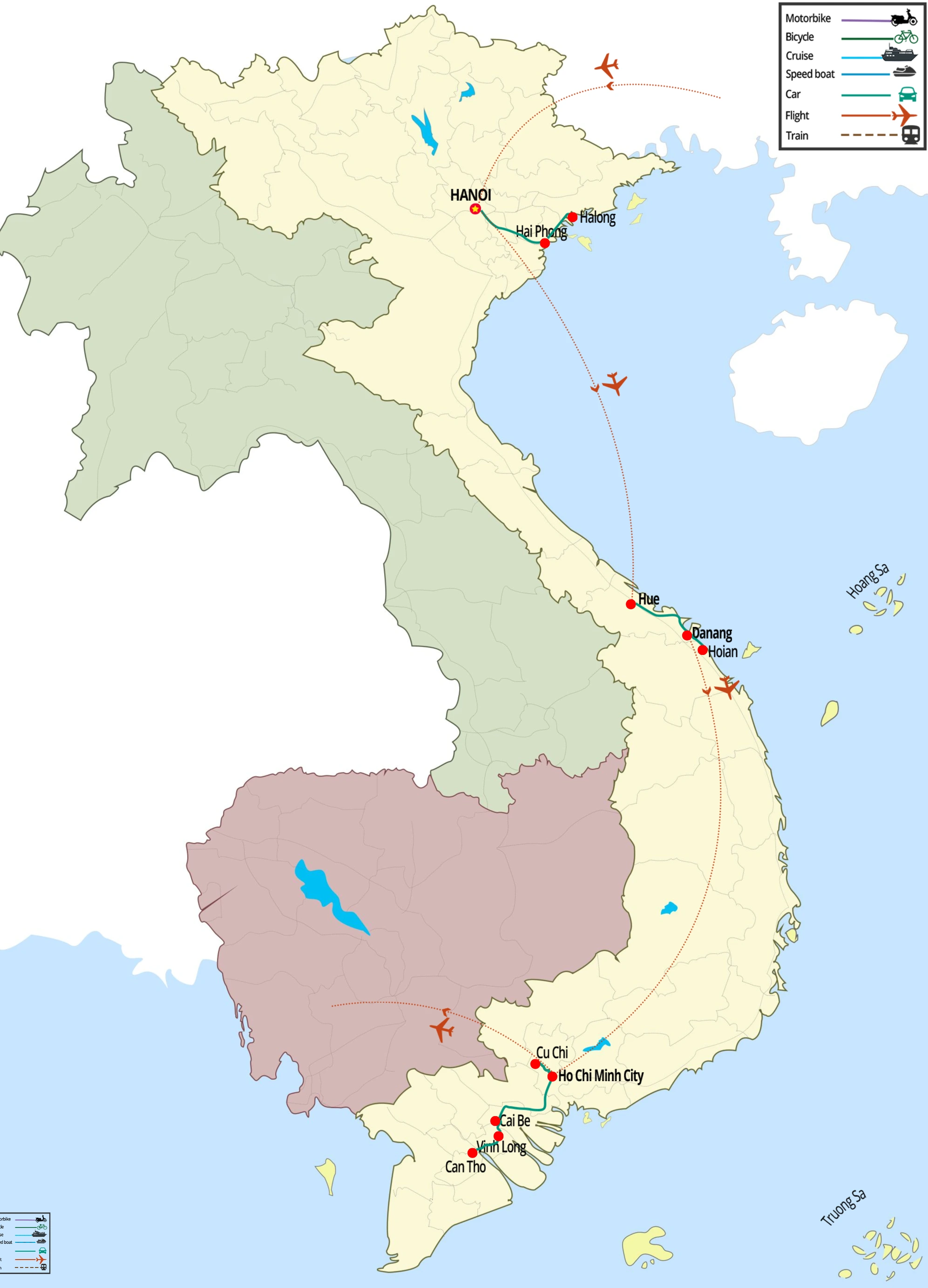 Disfrute de un cautivador viaje combinado de 12 días por Vietnam, sumérjase en las bulliciosas calles del casco antiguo de Hanói, navegue por las místicas formaciones calizas de la bahía de Halong y explore la antigua ciudad imperial de Hue. Recorra las encantadoras calles iluminadas por farolillos de Hoi An, adéntrese en la vibrante cultura e historia de Ciudad Ho Chi Minh y relájese en medio de los exuberantes paisajes del delta del Mekong, donde los mercados flotantes y las aldeas tradicionales ofrecen una visión de la auténtica vida vietnamita.