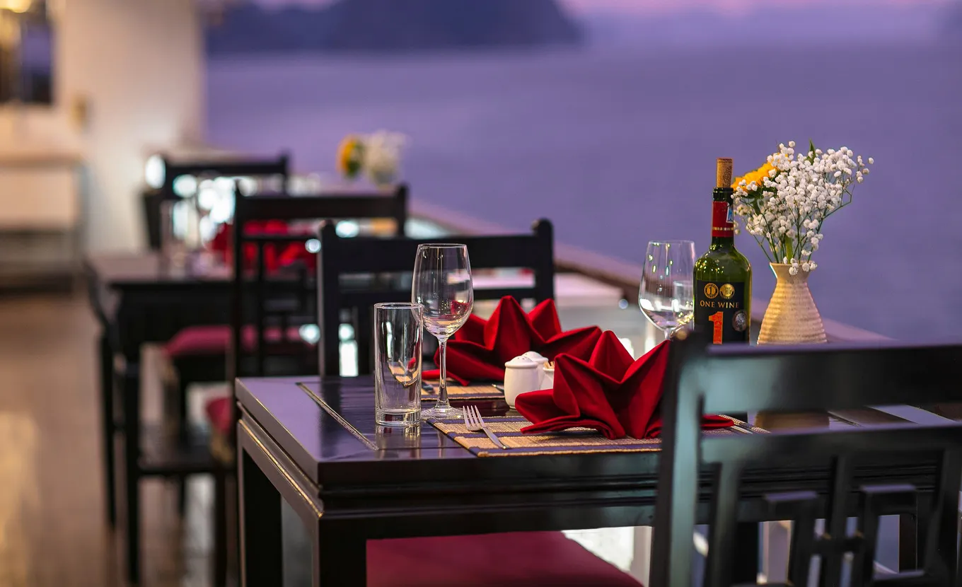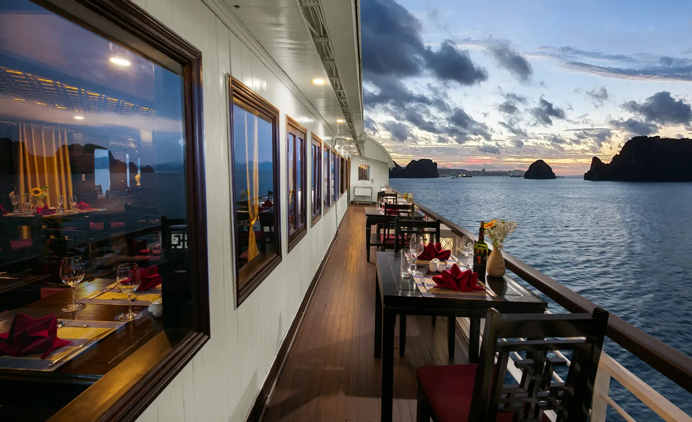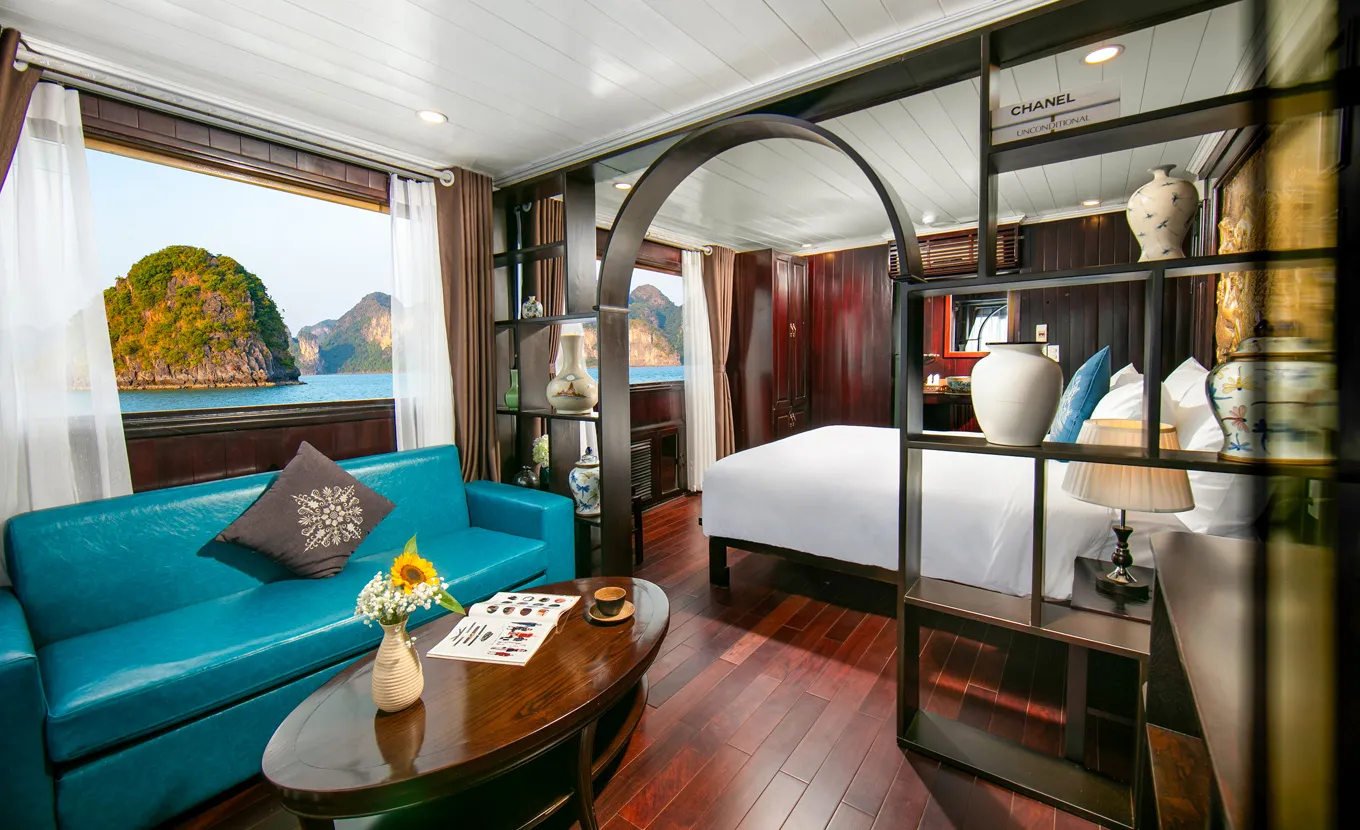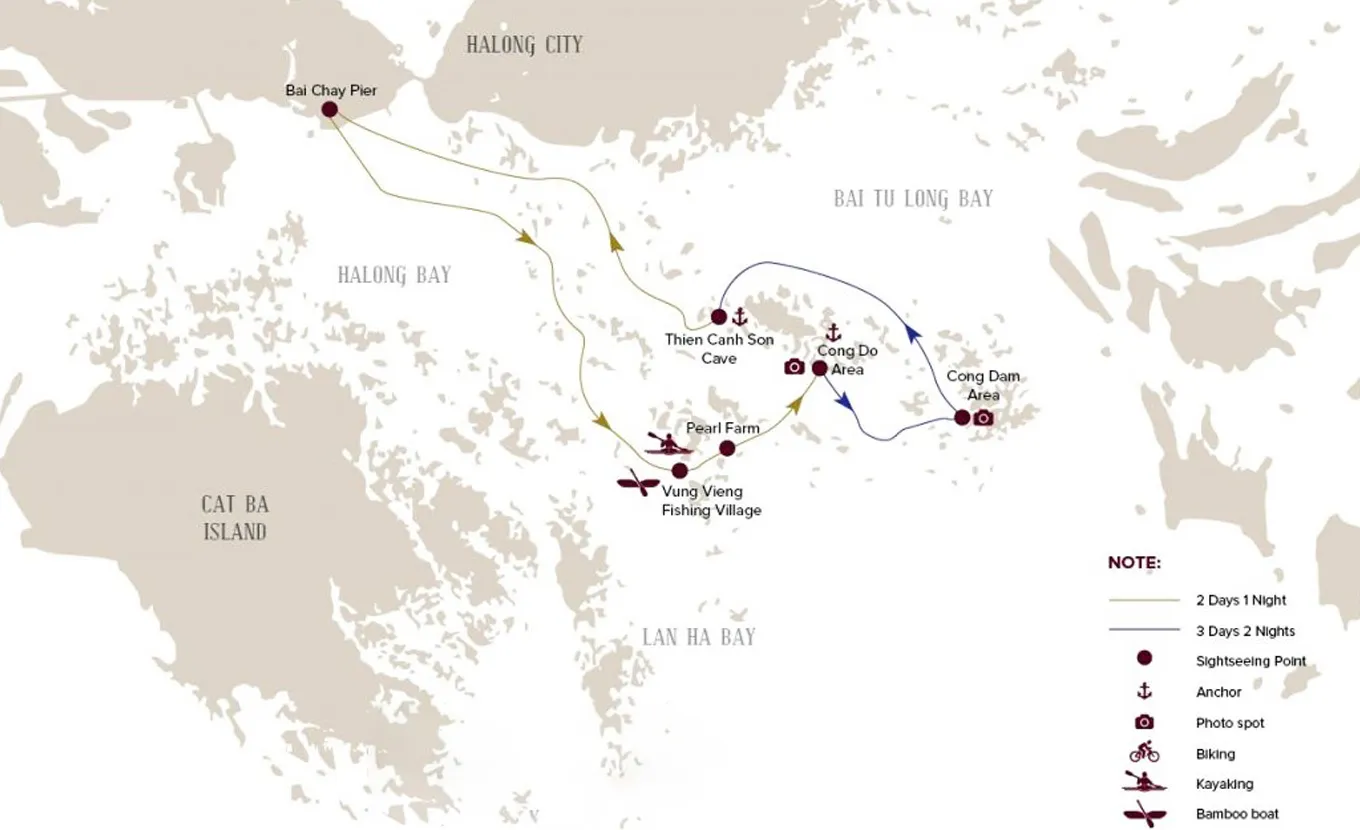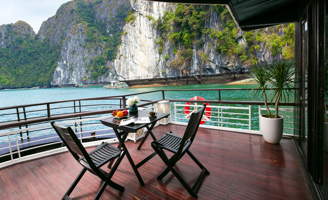 12:15 - 12:30: Acomode-se a bordo com um drinque de boas-vindas da equipe do La Regina Classic, enquanto o gerente do cruzeiro lhe dá informações sobre segurança. Em seguida, o barco zarpará para a Baía de Bai Tu Long, muito menos lotada do que sua vizinha, a Baía de Halong.