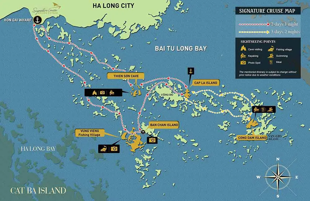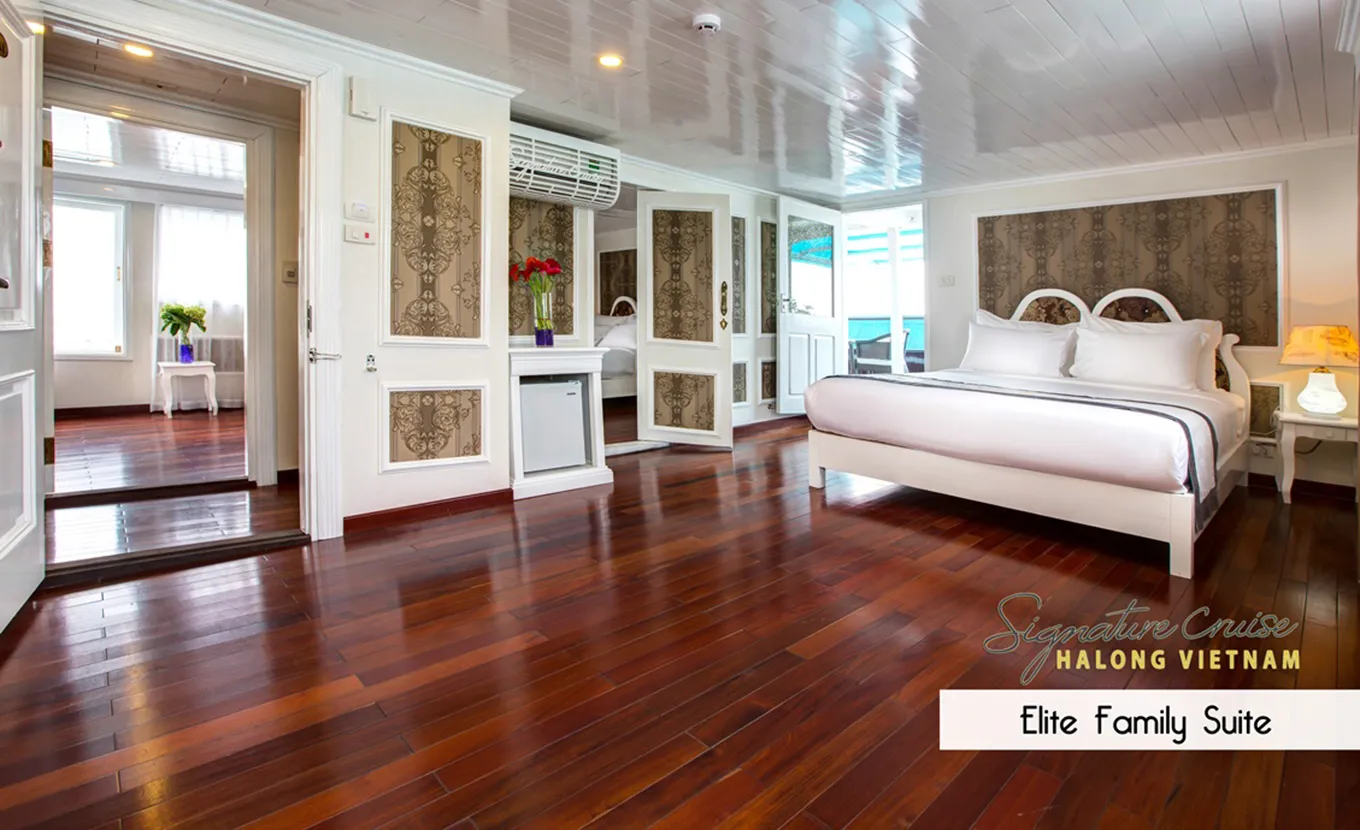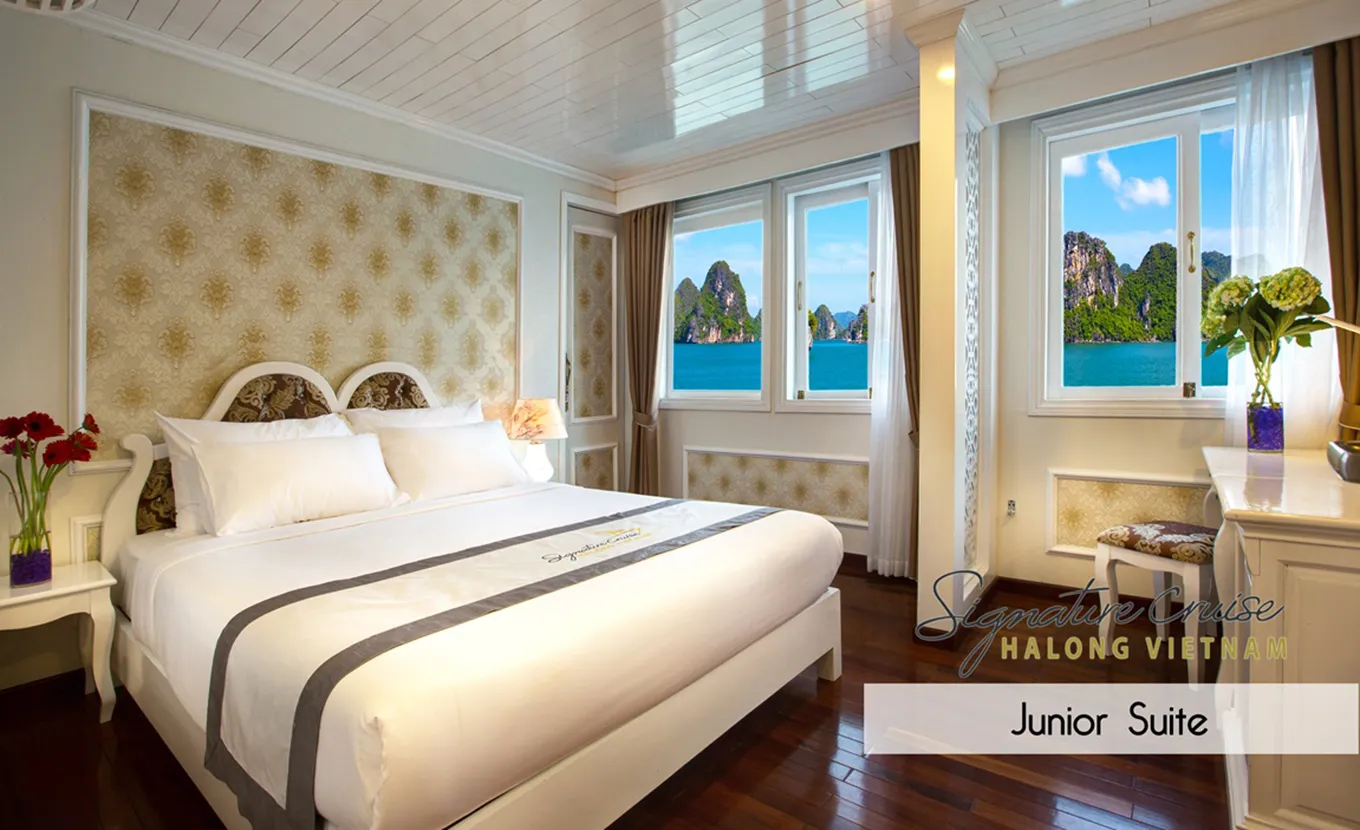 O cruzeiro Signature Royal tem o orgulho de oferecer instalações de alta qualidade e serviços especiais aos clientes. Vamos nos juntar à viagem do Signature Cruise para descobrir cenários espetaculares ao redor da Baía de Tonkin, incluindo a Baía de Halong, a Baía de Lan Ha, a Baía de Bai Tu Long e muito mais.