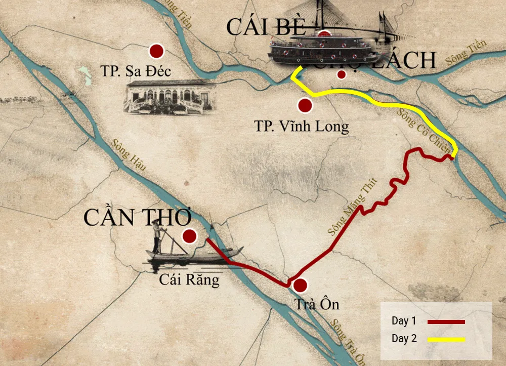 O Bassac atravessará pelo rio Co Chien e depois virando para o canal Cho Lach por 30 minutos através do tráfego de barcaças de areia e arroz, em cenários de instalações de secagem de frutas e estaleiros de construção de navios de madeira.