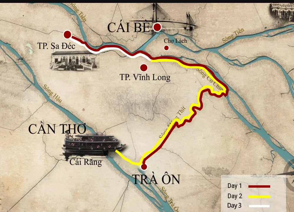 8:00 AM: Você será pegado no seu hotel em Saigon (centro da cidade - Distrito 1) em direção ao Delta do Mekong. Desfrute da paisagem campestre pacífica, cidades pequenas, aldeias entrelaçados em harmonia com os rios e campos verdes e pomares. Ao chegar, receberá uma recepção calorosa.