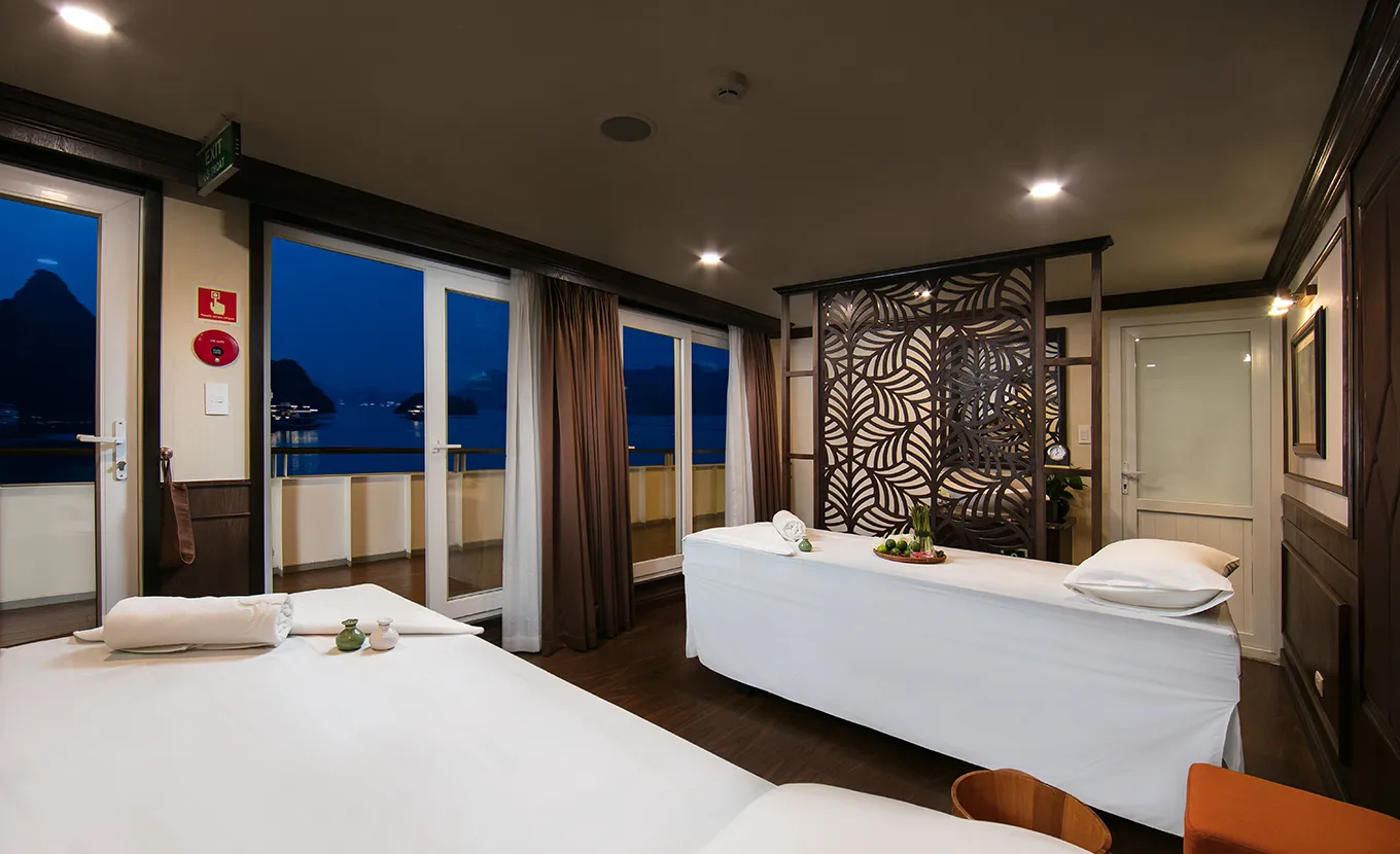 18h30: Depois, participa de uma demonstração culinária para conhecer a nossa cozinha vietnamita. Você também pode desfrutar do serviço de massagem disponível a bordo. (Por favor, reserve diretamente com o Gerente de Cruzeiro no barco)