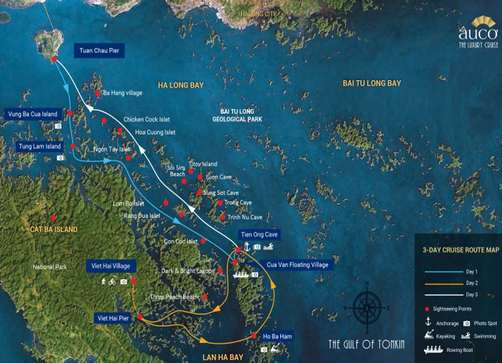 Ne ratez pas l’occasion d’explorer la baie d'Halong classée au patrimoine mondial de l'UNESCO pour ses exceptionnelles valeurs culturelles et géologiques par une croisière de 3 jours et 2 nuits avec The Au Co. Avec une large gamme d'activités à bord, The Au Co vous promet une expérience inoubliable de découvrir le golfe du Tonkin en relaxation totale.
