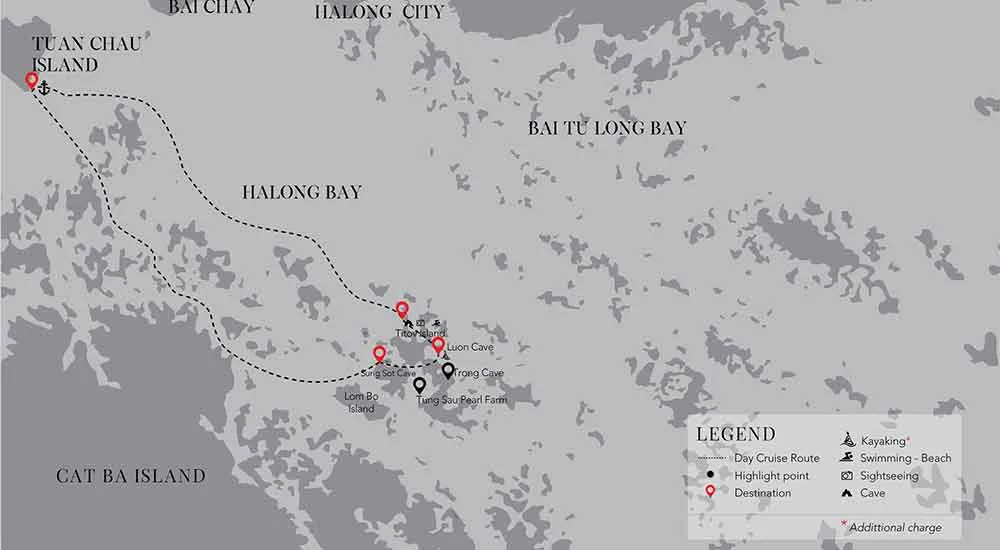 Note: l’itinéraire peut être modifié sans préavis en raison des conditions de croisière. Une connexion Wi-Fi est disponible dans le bar/ restaurant, mais l’accès à l’internet est peut- être limité en raison de la géographie de Halong. Merci de votre compréhension.