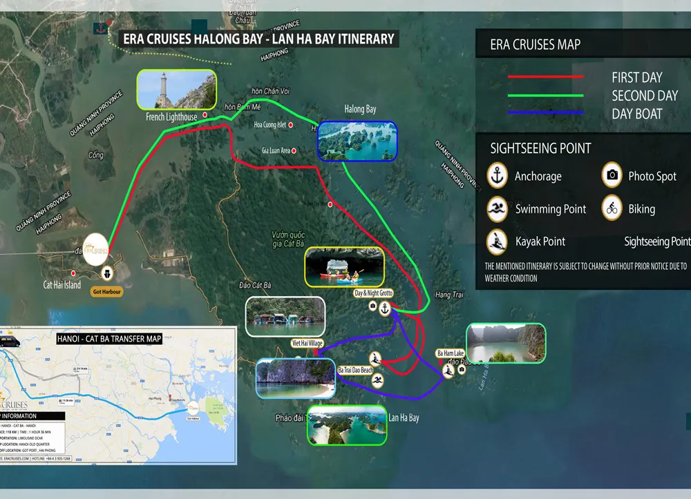 Era Cruises offre l’expérience de croisière à bord d’un bateau de luxe. Son espace somptueux et élégant vous donne nombre de possibilités de détente et de ressourcement avec une vue magnifique sur le patrimoine mondial de l’UNESCO - Baie d'Halong et l’île de Cat Ba. L’itinéraire de trois jours vous invite à explorer en profondeur un décor naturel à couper le souffle et la vie locale authentique.