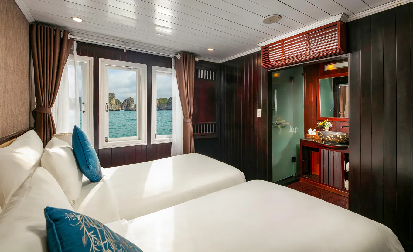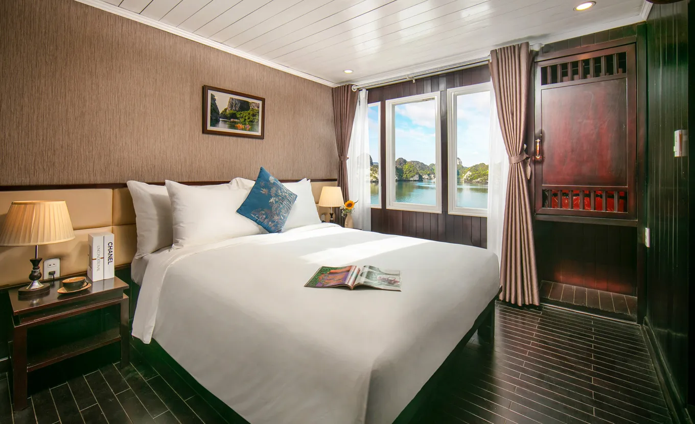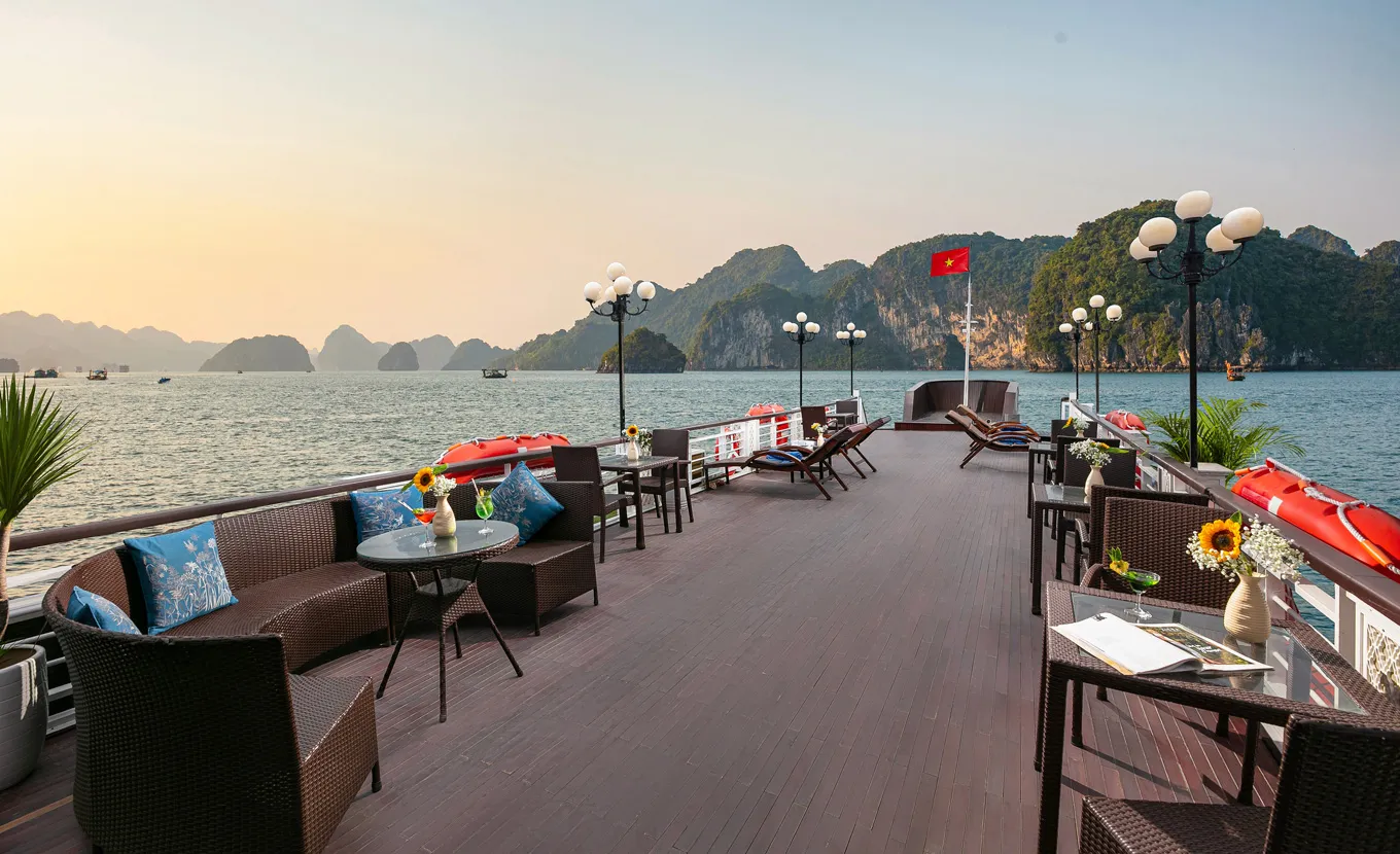 12:15 - 12:30: Acomode-se a bordo com um drinque de boas-vindas da equipe do La Regina Classic, enquanto o gerente do cruzeiro lhe dá informações sobre segurança. Em seguida, o barco zarpará para a Baía de Bai Tu Long, muito menos lotada do que sua vizinha, a Baía de Halong.