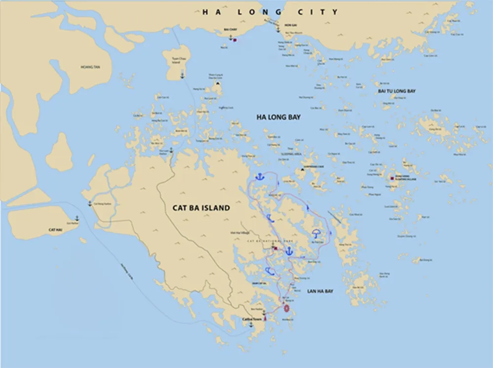 Dois dias e uma noite navega para a baía de Lan Ha selvagem e uma parte da baía de Bai Tu Long no nosso barco Cozy Boutique da equipe Cozy & Ocean Cruises, este cruzeiro é ideal para que você descubra a beleza natural e a vida local no tempo limitado. A vantagem deste itinerário é que você não precisa visitar nenhuma caverna. Você terá mais tempo para andar de caiaque e desfrutar da beleza de uma praia selvagem e visitar uma aldeia de pescadores. Admire as maravilhas naturais e pernoite uma noite memorável na baía calma. Os nossos funcionários estão prontos para atender ao pedido dos turistas.