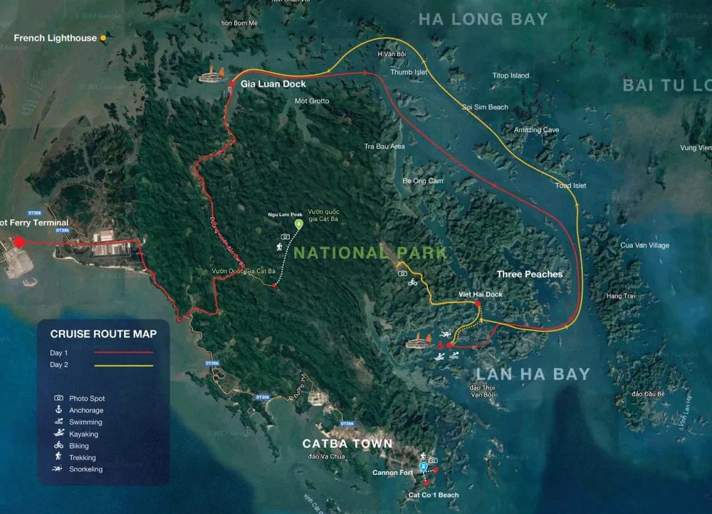 Continua em direção à baía de Lan Ha na rota escondida para vários pontos turísticos, passa pela caverna Escura e Brilhante, Lagoa Ao Ech (Lagoa das Rãs), Praia dos Três Pêssegos, Hon Dua (o ilhéu Pauzinho), estátua budista de pedra, etc. Chega na Lan Ha - a área reservada da Biosfera do Mundo, é famosa pelas suas águas cristalinas, lagoas redondas, grutas de túneis e aldeias de pescadores, etc. e especialmente pela fosforescência à noite.