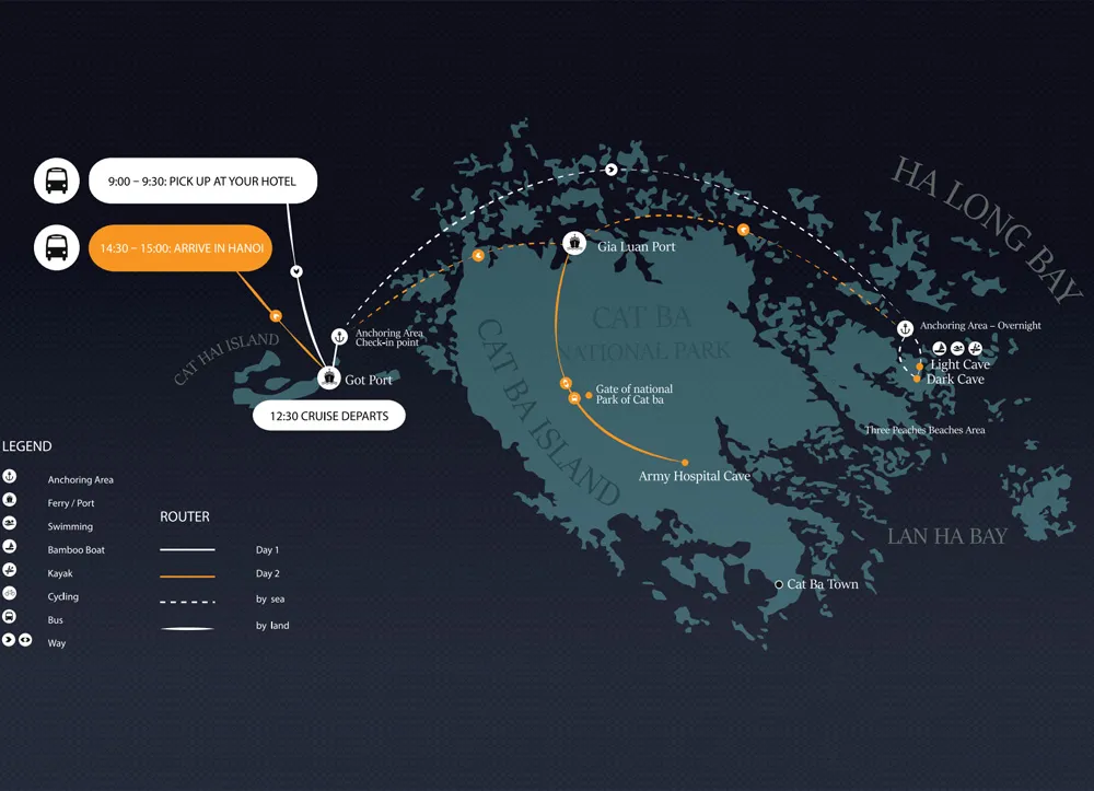 8h00: Depois pega uma rota de ônibus por cerca de 20 minutos na Ilha Cat Ba a partir do Cais de Gia Luan para visitar a caverna do Hospital do Exército, um lugar especial para guardar a história significativa vietnamita durante a guerra de resistência. Durante a viagem, você estará imerso no cenário natural selvagem e fresco do Parque Nacional de Cat Ba.