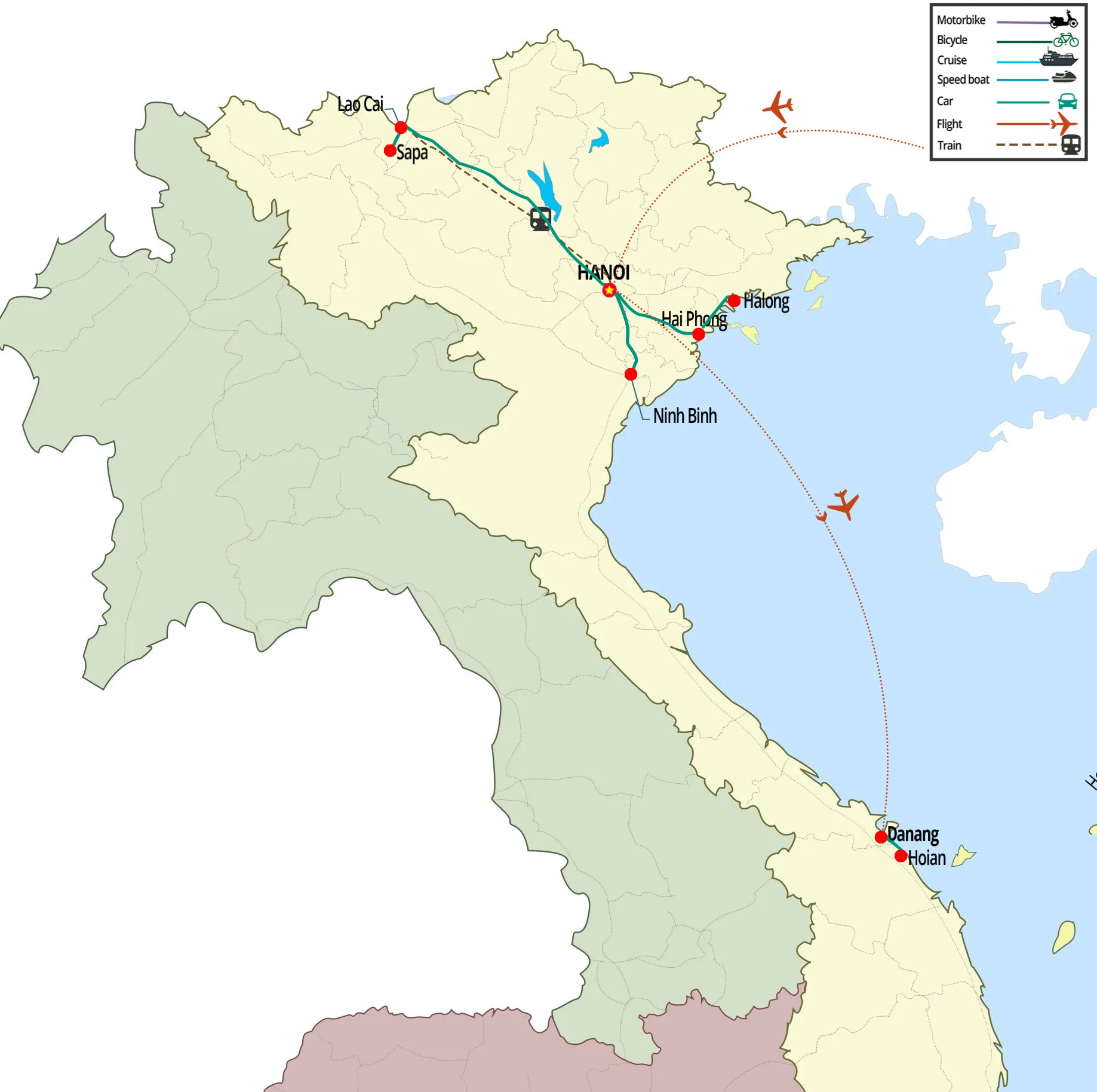 Uma visita guiada exclusiva, meticulosamente elaborada para revelar as joias requintadas do norte e do centro do Vietnã. Atravesse as cidades encantadoras de Hanói e Hoi An, mergulhe nas paisagens pitorescas de Sapa e Ninh Binh e mergulhe nas maravilhas de tirar o fôlego da Baía de Halong. Experimente a essência da rica cultura e da beleza natural do Vietnã nesta viagem inesquecível